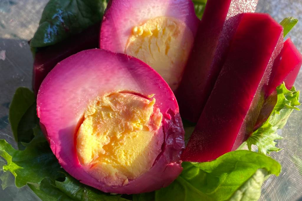 A wise person knows to never let a gift spoil, so when I found myself with a wealth of eggs to use or lose, I thought of ways to make them last long enough to be eaten. Pickled eggs are an excellent way to extend the life of precious protein for when times are lean. These eggs are pickled along with roasted beets and dill, which gives them a cheerful hue and bright aroma. Served together on a bed of greens, this makes a light lunch that won’t weigh me down on the climb toward my bright future.