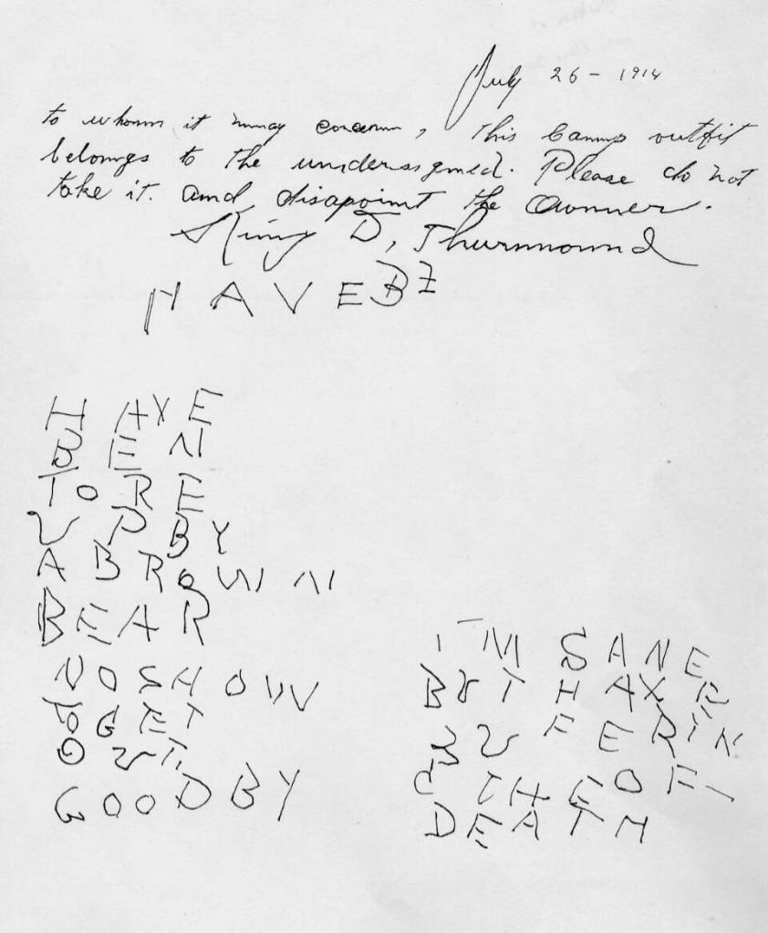 “HAVE BEN TORE UP BY A BROWN BEAR. NO SHOW TO GET OUT. GOOD-BY. I’M SANE BUT SUFERIN [?] THE OF—DEATH.”