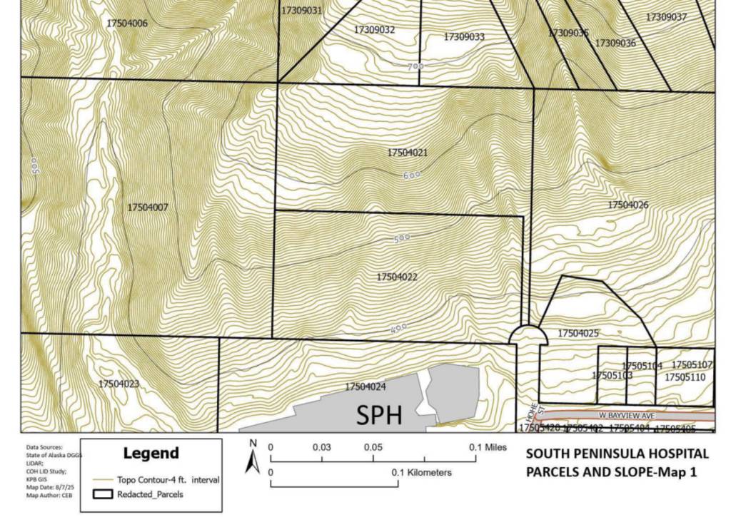 A map from a South Kenai Peninsula Hospital Service Area Board resolution in support of the land buy ordinance shows the location of South Peninsula Hospital in regard to the steep slopes surrounding the property. Parcel #17504022 is one of the four properties assembly members unanimously voted to purchase on Tuesday, Aug. 19.
