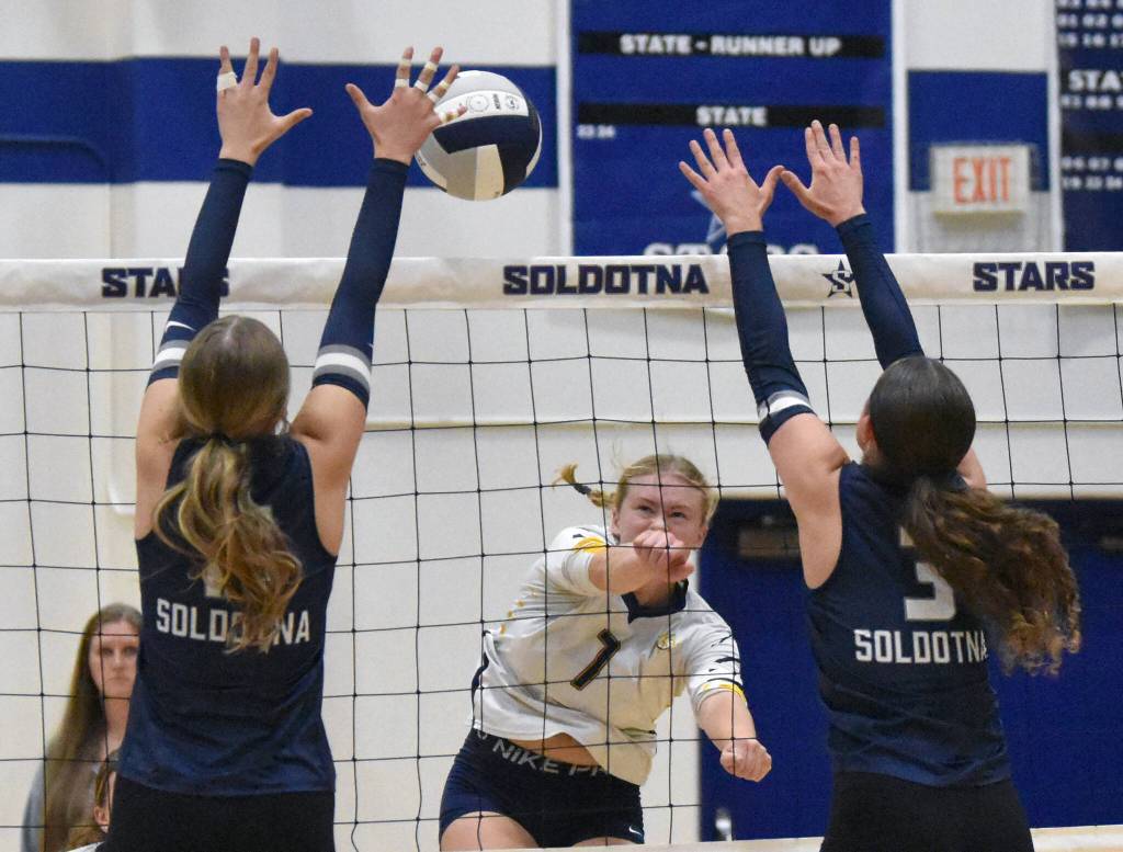 Soldotna head coach Luke Baumer was impressed with Homer’s overall scrappiness and the outside hitting of Swift Blackstock and Reilly Sue Baker. The coach said both of them swing very high and fast.