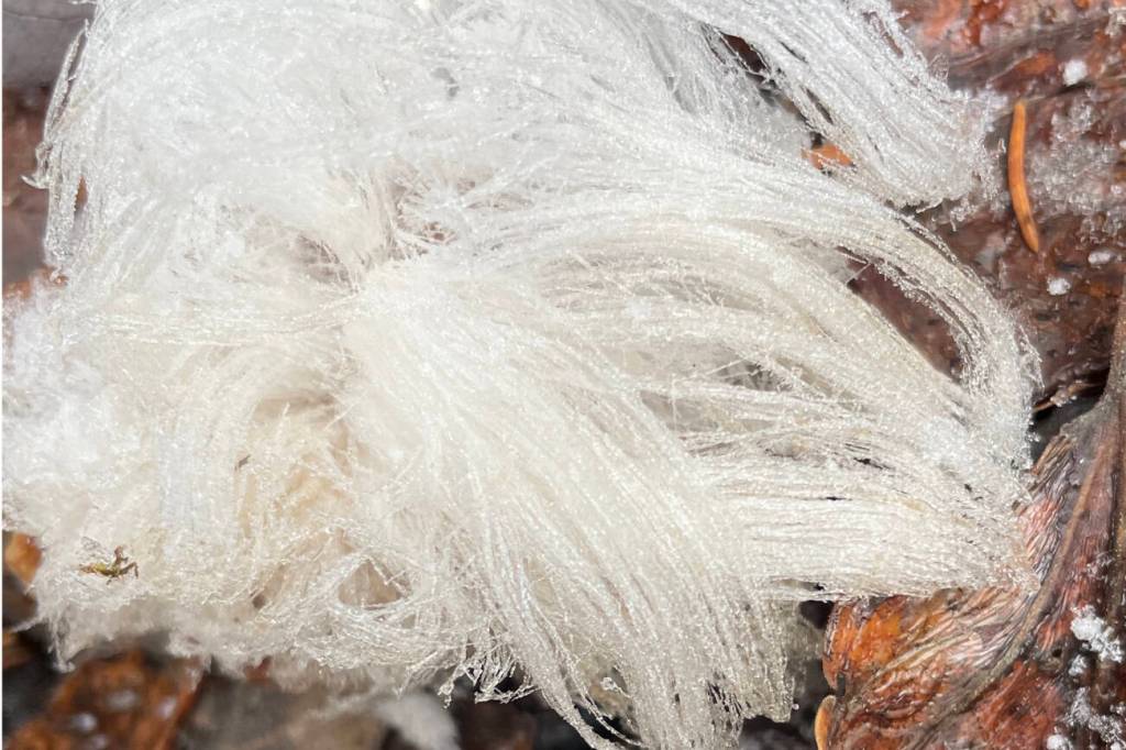 Chris Greenfield-Pastro of Fairbanks sent in photos of what she called “hair ice” blooming from the forest floor behind her house. In her images, delicate white lashes of ice curve from woody debris and hunks of fungus.