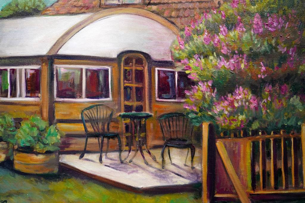 Across the walls are paintings, a “snapshot” of Alaska as Scrivner sees it. She moved to Alaska around eight years ago and sees things “people have maybe gotten too used to seeing.” On one wall are vivid depictions of some familiar sights of Kenai’s Old Town, like the Veronica’s Cafe sunroom. On another are scenes of both set- and dipnetting.