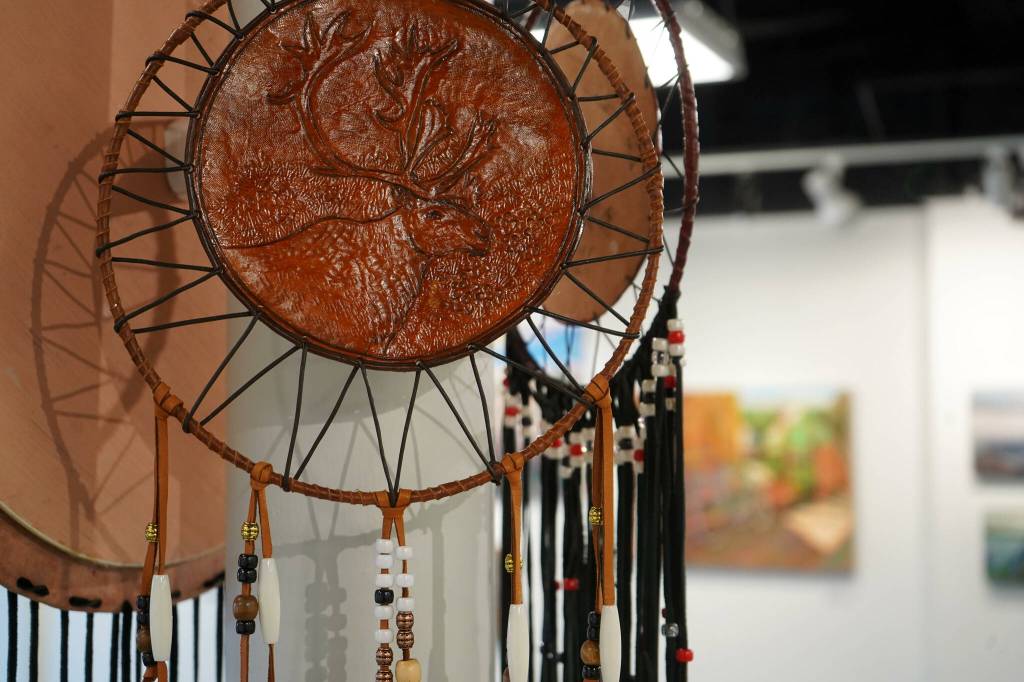 Alongside the paintings are works of glass, leather, wood and sculpture. Scrivner said she has a passion for art, and likes to “mix it up.” That passion is one she discovered when she moved to Alaska at a time she was facing severe health issues that also stopped her from singing, her first artistic passion.
