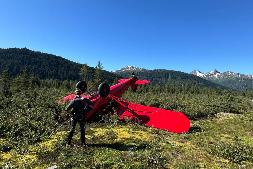 A MH-60 Jayhawk helicopter aircrew from Coast Guard Air Station Sitka was dispatched to search for the plane, which they located, overturned, at 10:25 a.m. near the Endicott River.