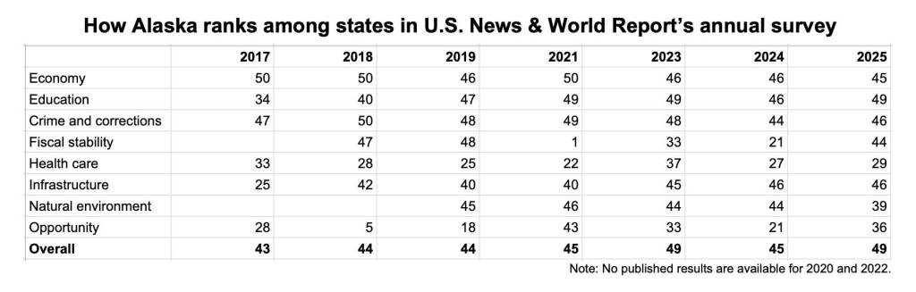 Alaska ranks 49th out of 50 in the annual Best States survey published Tuesday by U.S. News & World Report, a drop of four spots from last year as scores for fiscal stability and opportunity dropped markedly.