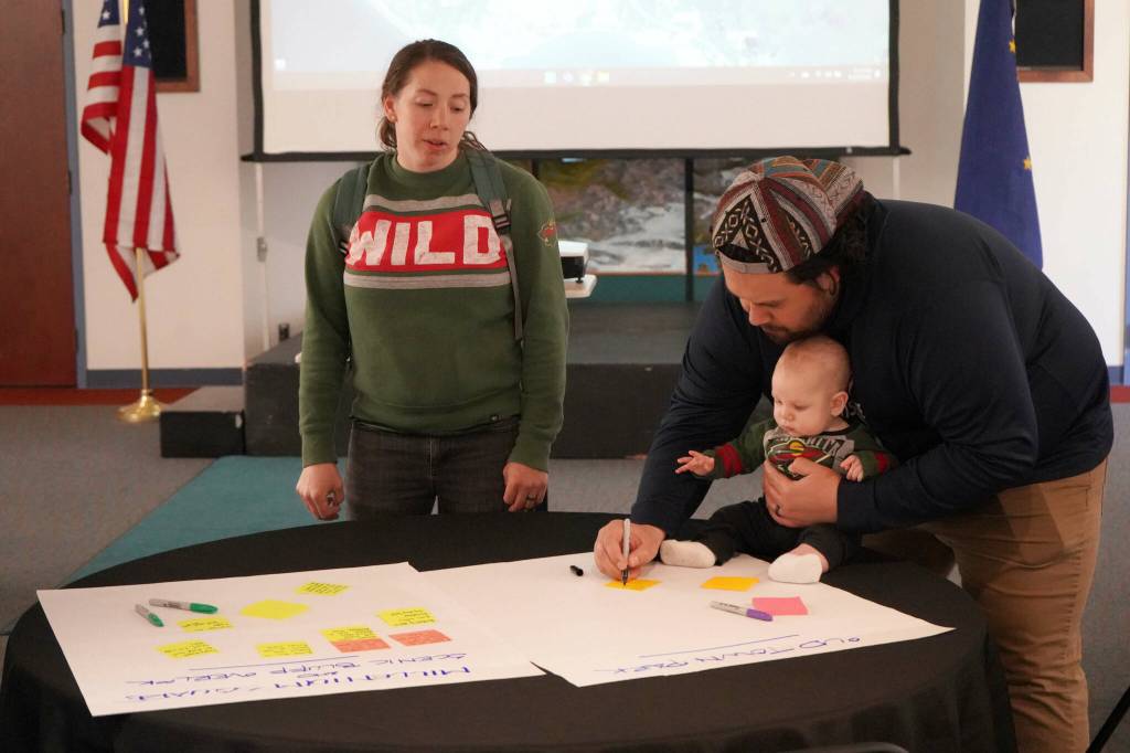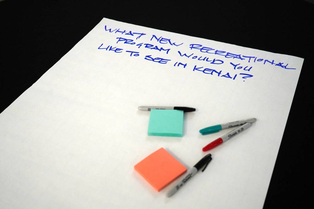 A dozen attendees were asked to share what they like about Kenai’s parks, what they wish local parks had or what needs to be improved. People wrote their feedback on large sheets of paper representing each of the city’s parks and shared thoughts on bigger questions like “What new recreational program would you like to see in Kenai?”