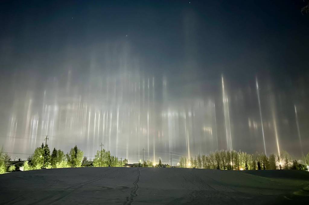 I had seen light pillars before in Fairbanks, but not that vivid. Looking back in the rearview mirror while idling in the drop-off line, I could see a flurry of diamond dust in the flash of the car headlights behind me.