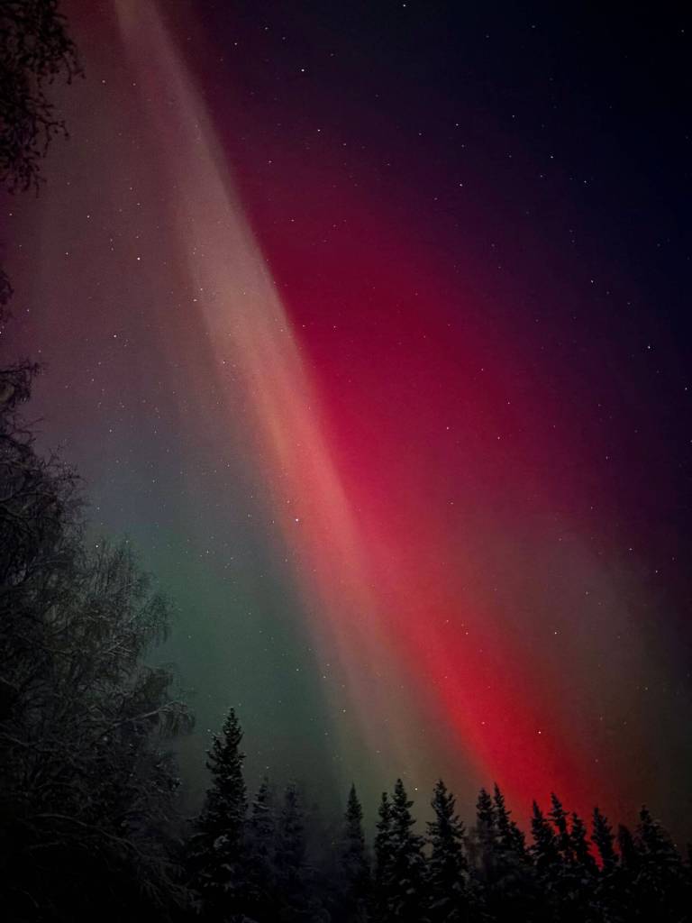 Many other people, however, ventured out to drink in the rare event. Among them was my morning rider, high-school sophomore Nora Carlson. During the next morning’s drive, she texted me her picture of the red aurora.