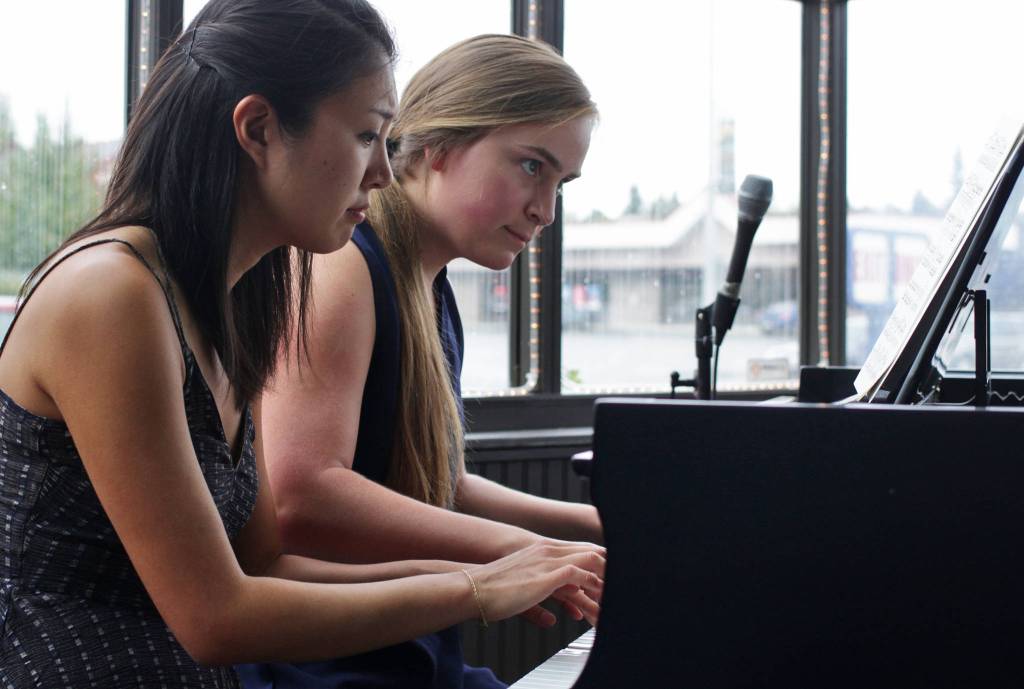 During a stop on her Listen Hear Alaska tour, classical pianist Miki Sawada (left) played a four-hand piece — “Slavonic Dances” by Antonin Dvorak — with local pianist Kerri Ann Peek at Odie’s Deli in Soldotna on Friday, August 25. After a Sunday show in Homer, Sawada continued her three week tour with a drive to Talkeetna to play at the Fairview Inn.