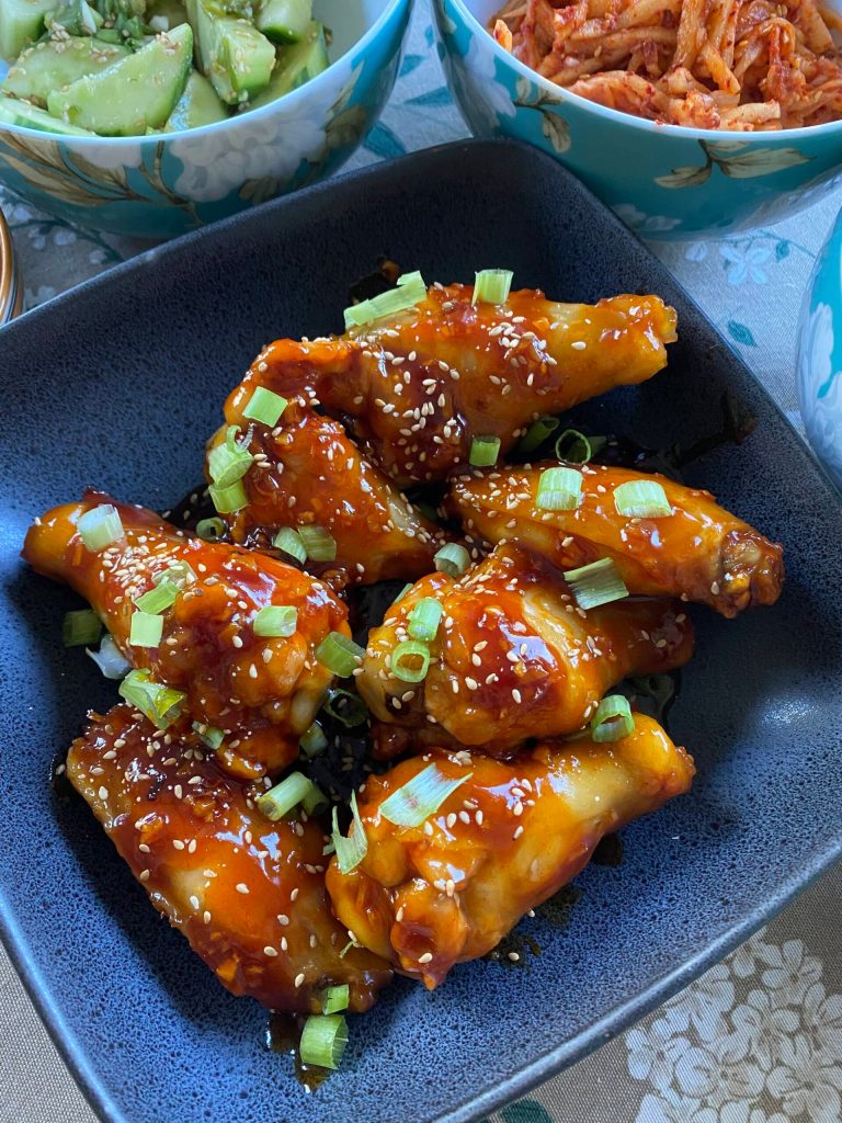 These chicken wings are sweet, mildly spicy, and fragrant with fresh ginger and garlic. They are sticky and messy not healthy at all, so they are best enjoyed as a side dish to seasoned vegetables and in the comfortable company of old friends.