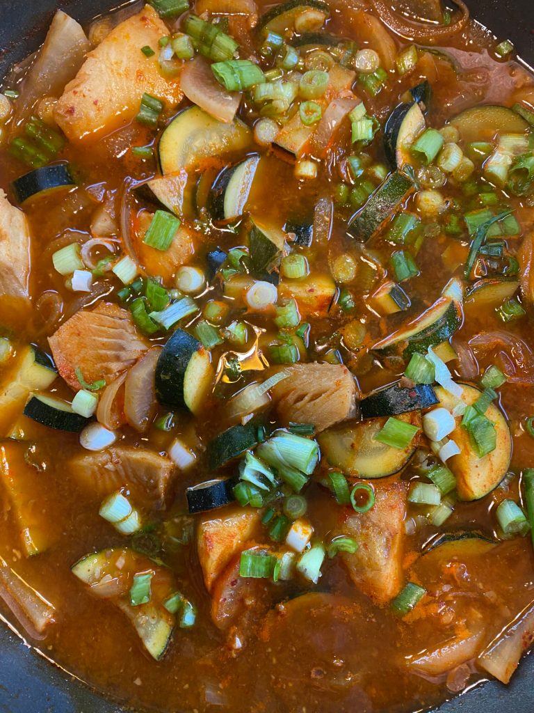 I have baked it in a pouch slathered with miso paste (highly recommended) and have served it simply steamed with ginger and cilantro (not so highly recommended), but this time I wanted to use it in a spicy Korean fisherman’s stew called “maeuntang.”