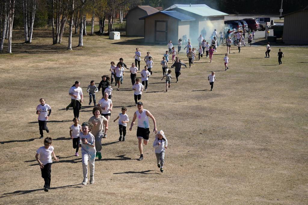 Around 70 youngsters gathered in front of the school under a balloon-arch finish line. They made two laps around the perimeter of the school grounds, over the school’s large hill and through a wooded area on one side of the playground. At stations along the route, parents and teachers hurled brightly hued powder — most participants had started with plain white shirts and finished with a mixture of purple, blue, green, pink, orange and yellow.