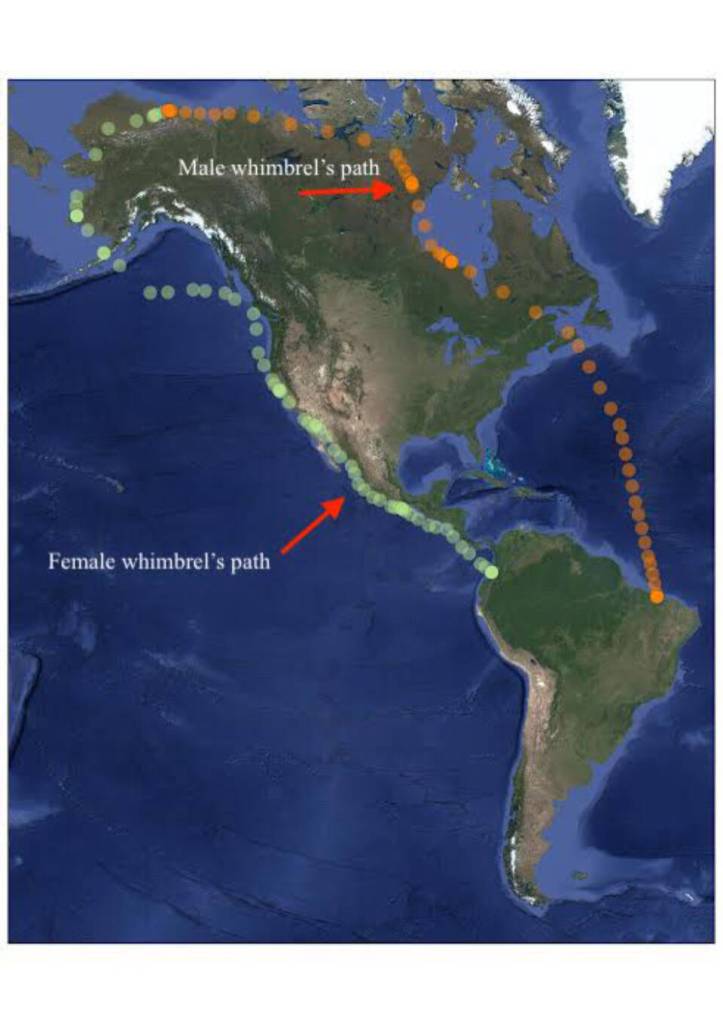 The whimbrels winter apart on opposite coasts of South America.