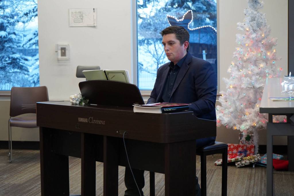 After Corey and Pate departed, taking their guitars with them, the next two artists played the library’s piano. Justin Ruffridge played Holiday-flavored jazz piano and was followed by Hannah and Josiah Burton. Josiah played the piano while Hannah sang along. They branched away from holiday-themed offerings, playing a variety of songs including “Somewhere Over the Rainbow.”
