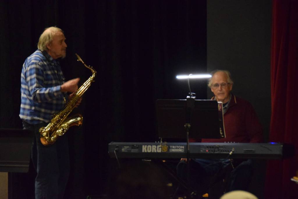 Musicians David Webster, Mark Robinson and Scott Bartlett, executive director of Homer Council on the Arts, joined one another onstage to perform on saxophone, keyboard and drums, respectively.