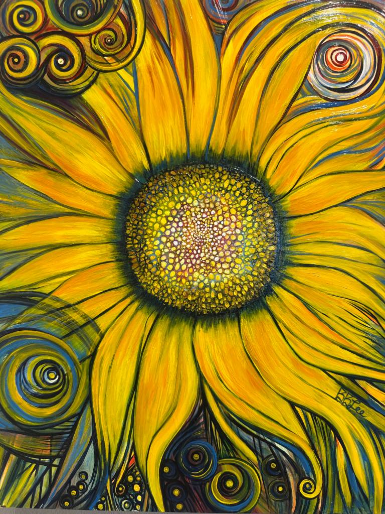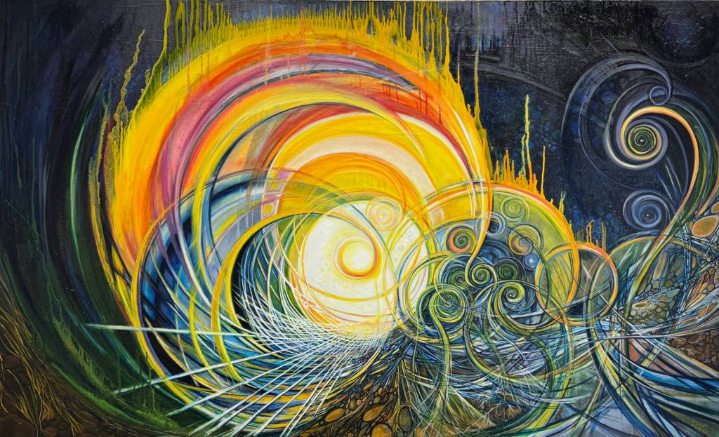 “I felt many things arise when I made this painting — movement, energy, life force, growth and healing,” she said. “I often approach a blank canvas with no initial sketch, but a stroke of color becomes the “seed,” informing me how to “grow” the piece into completion. This process can feel freeing, healing, and sometimes spiritual, like I’m connecting to something deep inside or beyond myself.